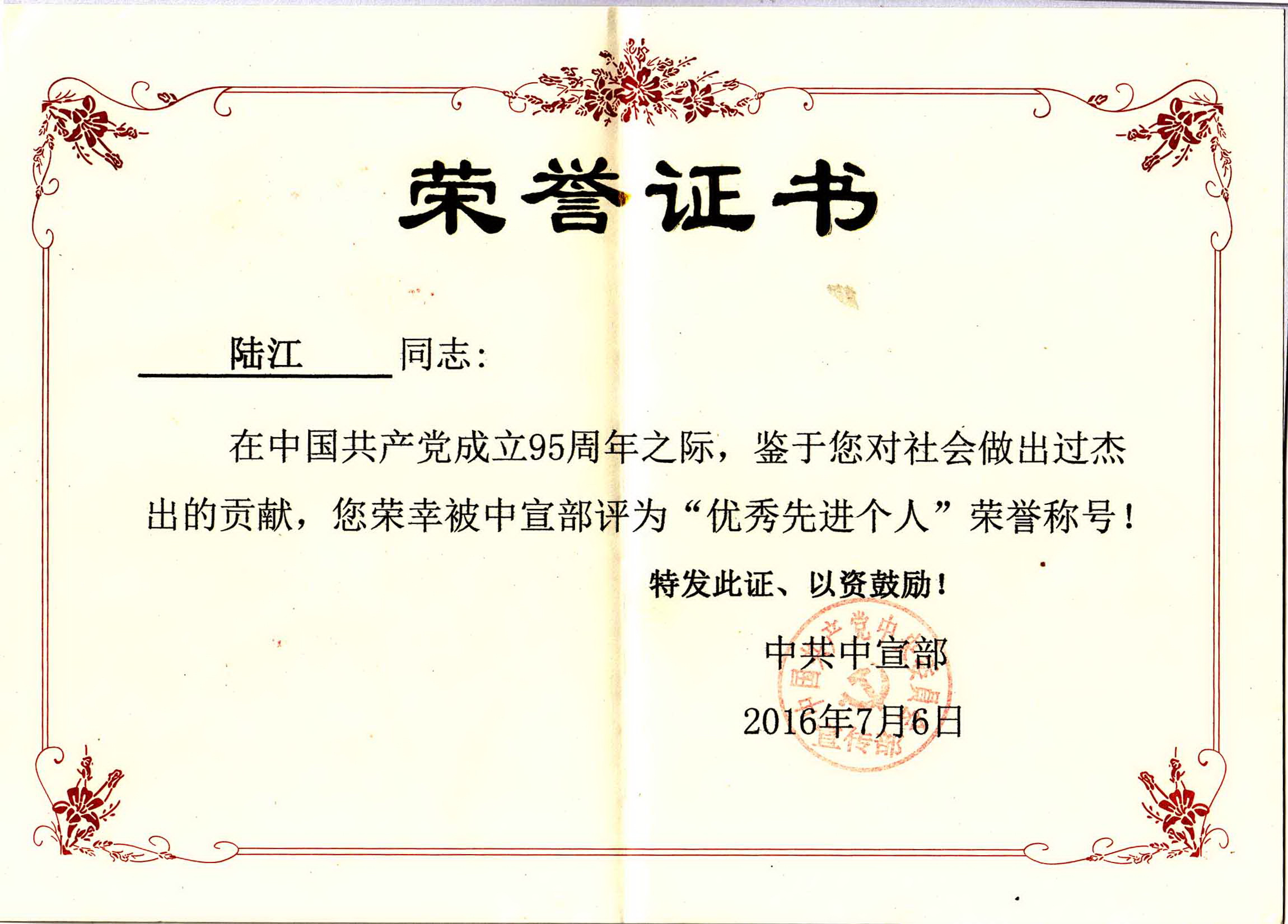 陸江的杰出貢獻被人民日報社評為先進個人